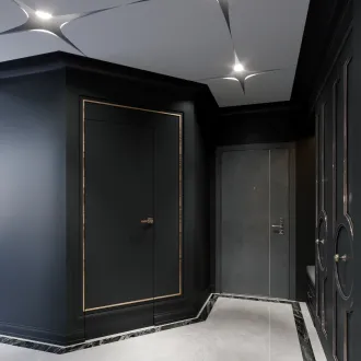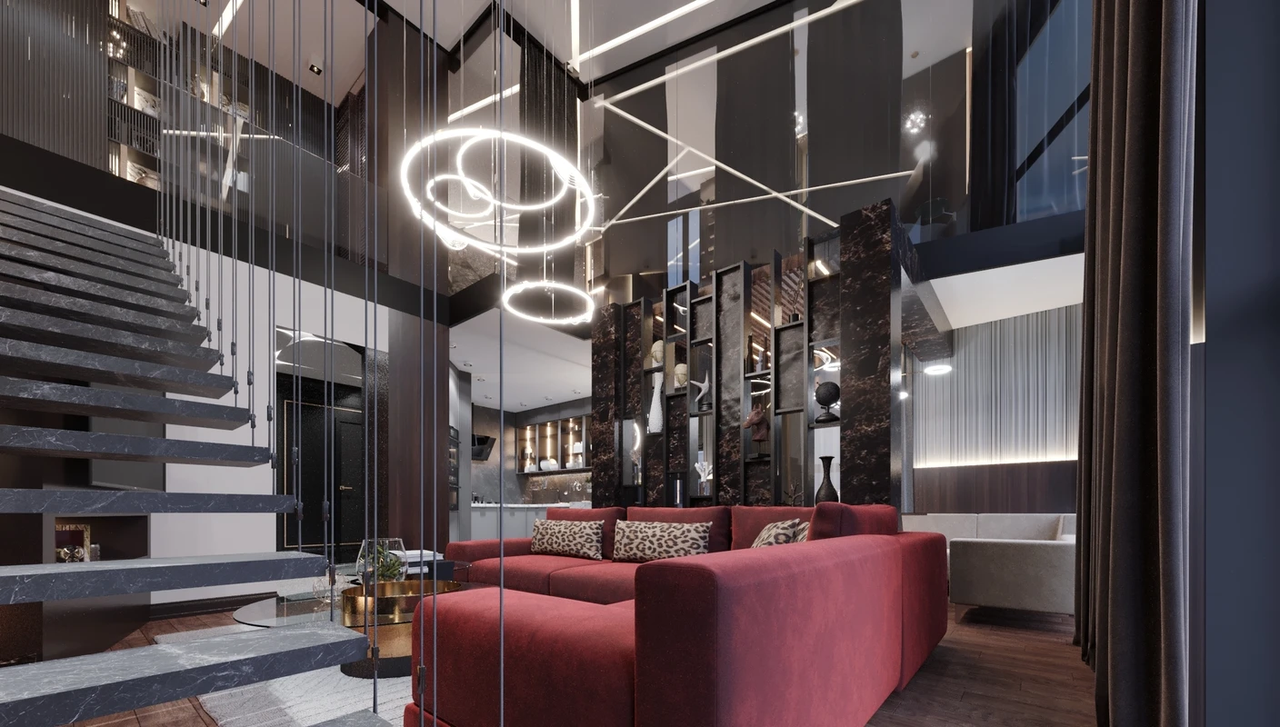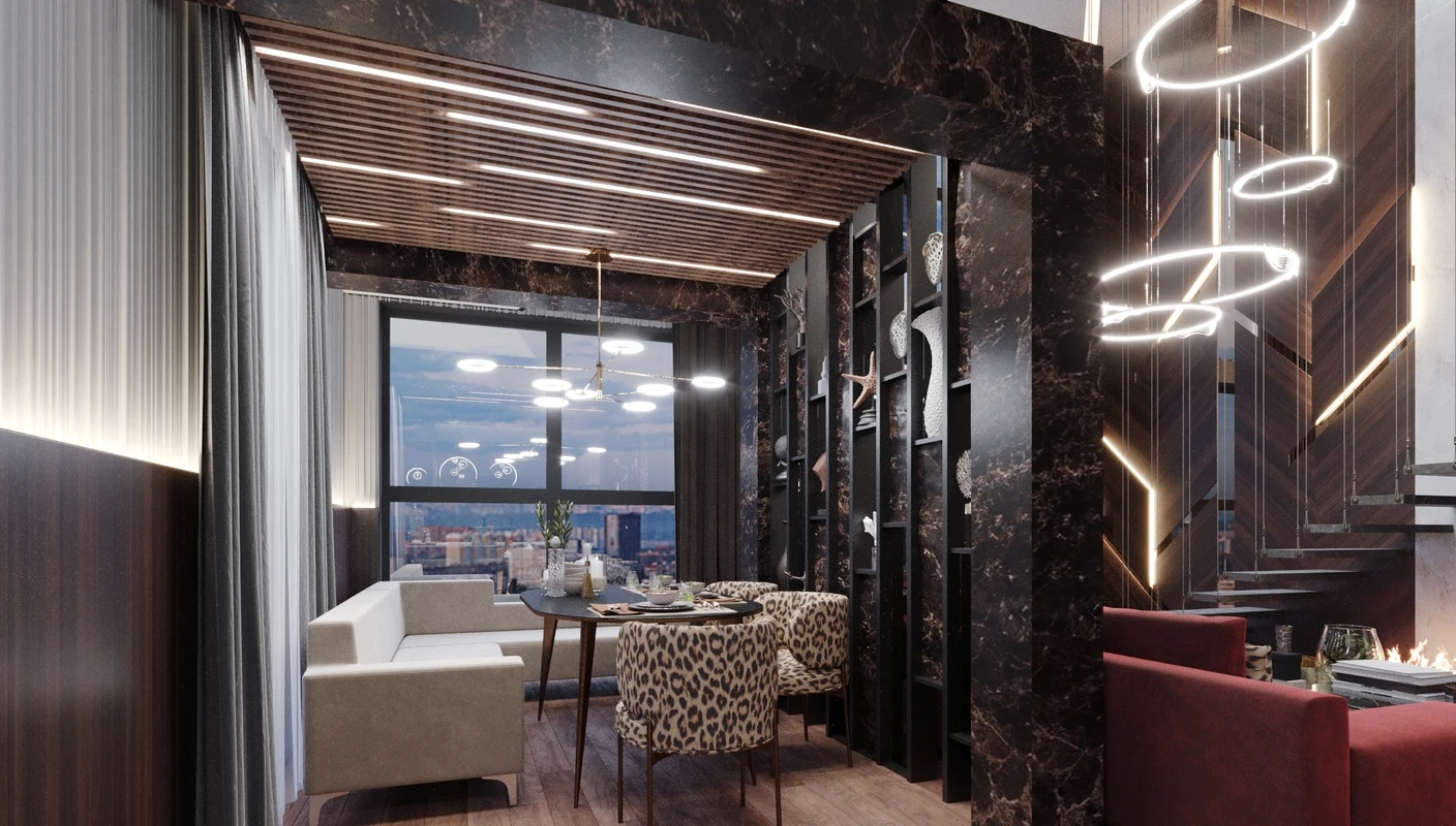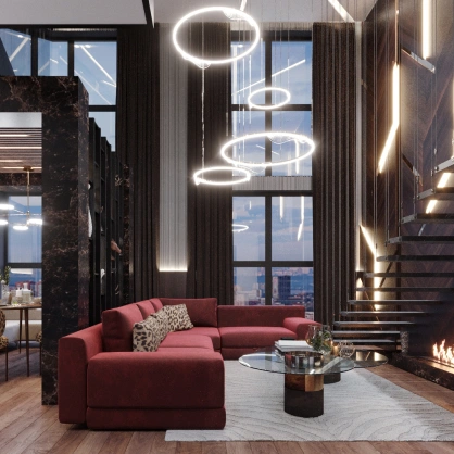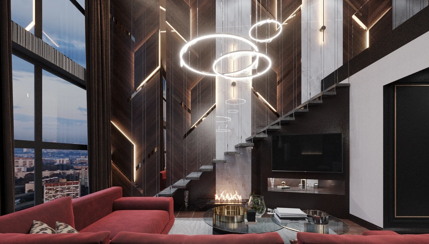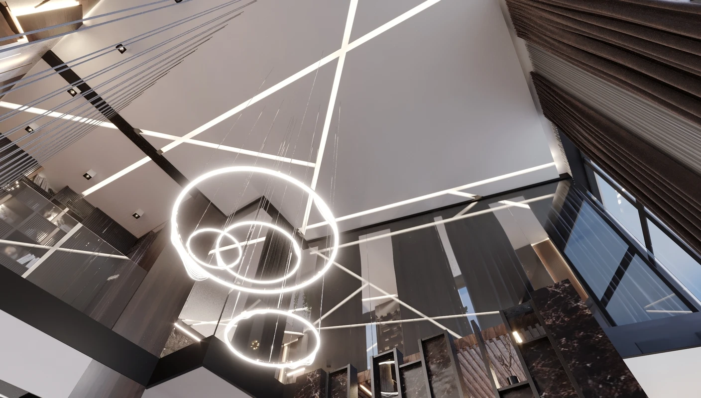 Цей дизайн інтер’єру ми розробили спеціально під замовника, врахувавши всі його побажання, стиль життя та індивідуальні звички. Наша мета – створити простір, у якому буде справді комфортно жити саме цій людині, цій сім’ї. У цьому випадку – це була двоповерхова квартира в Києві з акцентом на складну стелю та оздоблення преміум рівня, як того бажав замовник.