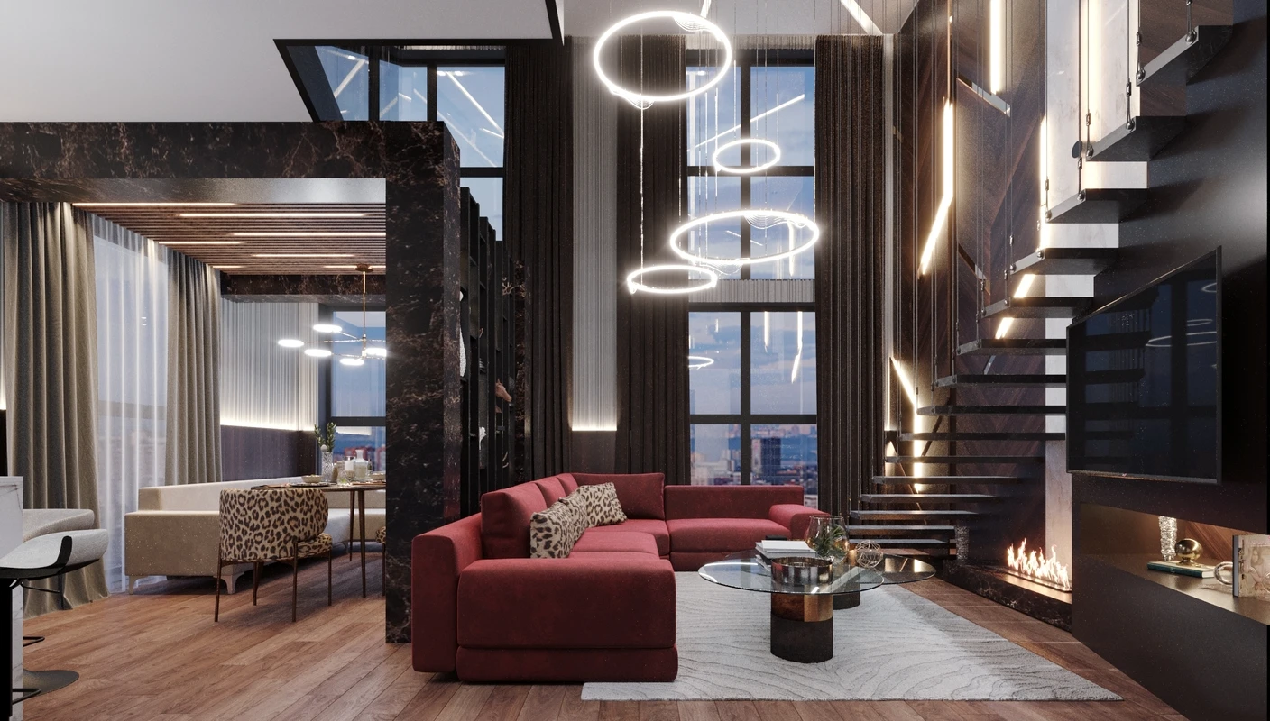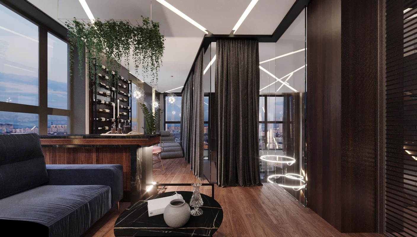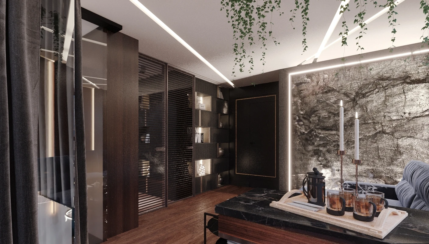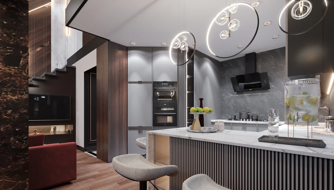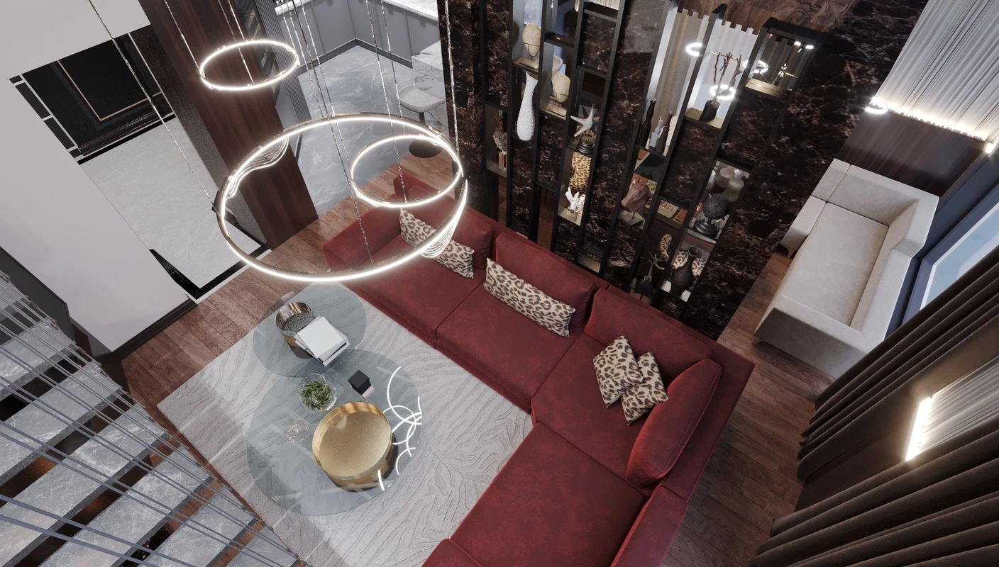 Цей дизайн інтер’єру ми розробили спеціально під замовника, врахувавши всі його побажання, стиль життя та індивідуальні звички. Наша мета – створити простір, у якому буде справді комфортно жити саме цій людині, цій сім’ї. У цьому випадку – це була двоповерхова квартира в Києві з акцентом на складну стелю та оздоблення преміум рівня, як того бажав замовник.