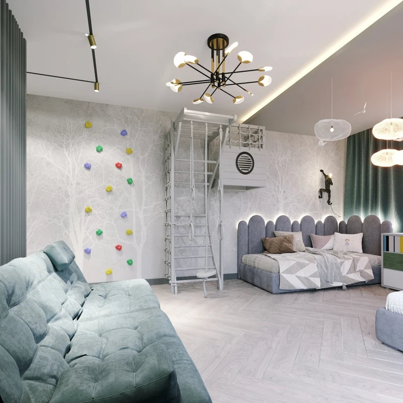Дитяча кімната площею 23 кв. м спроєктована з урахуванням потреб няні, яка іноді залишається на ніч. Простора вітальня завдяки продуманому зонуванню отримала панорамні вікна та високу стелю (5,7 м).