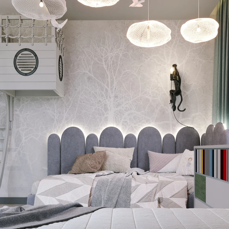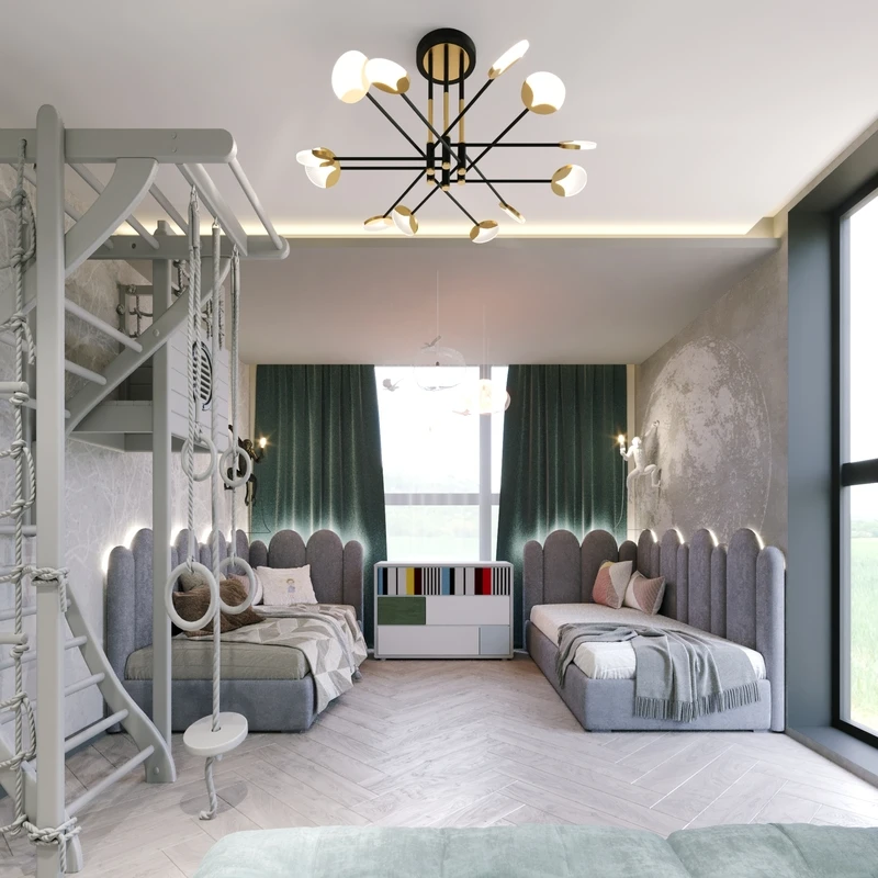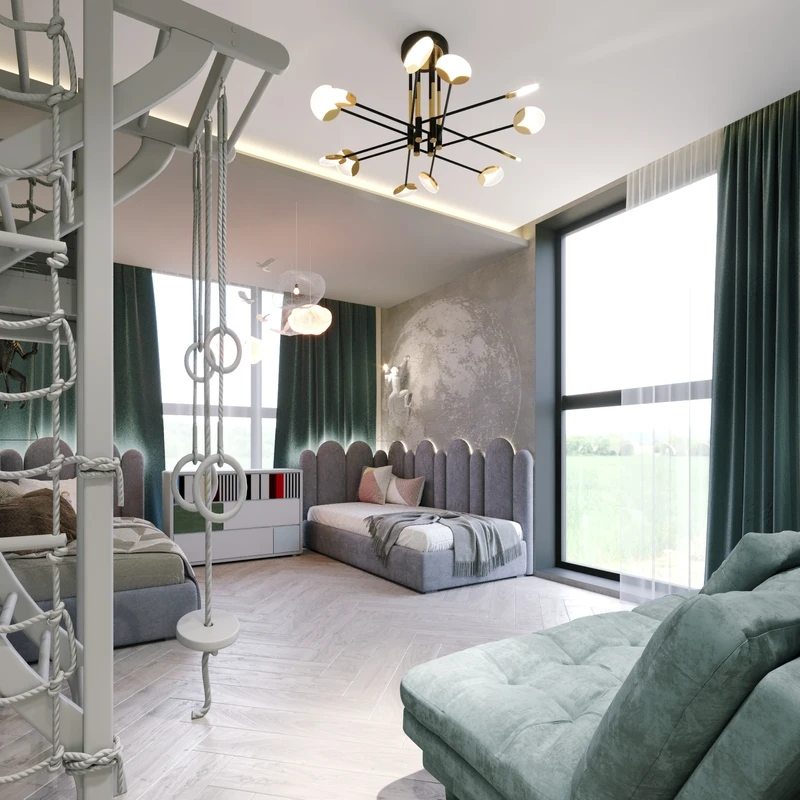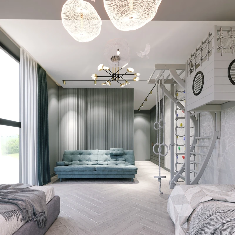 У новому проєкті перед нами стояли цікаві виклики. Однією з вимог було створення складної стелі, яку ми детально опрацювали. А другому поверсі потрібно було організувати приватну зону для батьків.