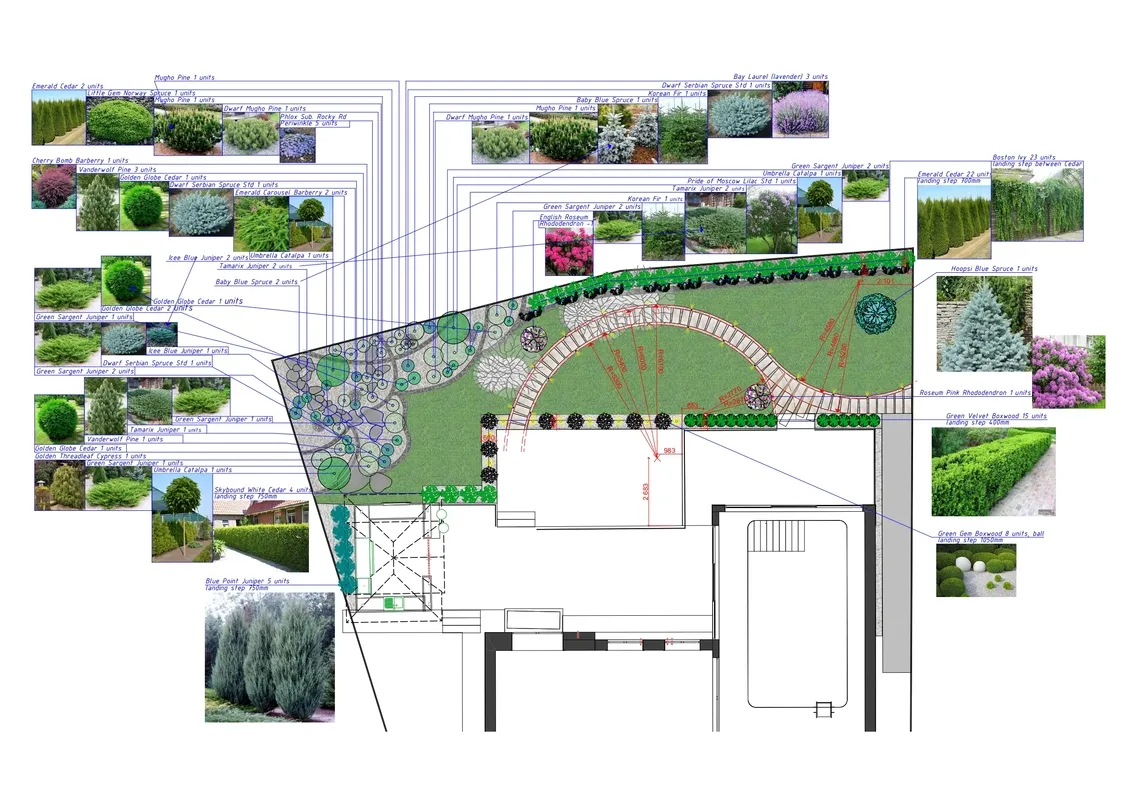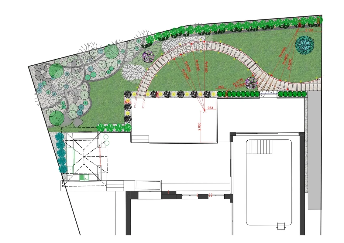 Основною метою було створення гармонійного озеленення позаду будинку. Головні виклики полягали в перепаді висоти, адже замовники прагнули максимально рівну поверхню ділянки. Додатковою складністю була невелика відстань до паркану, яка становила лише 5 метрів.