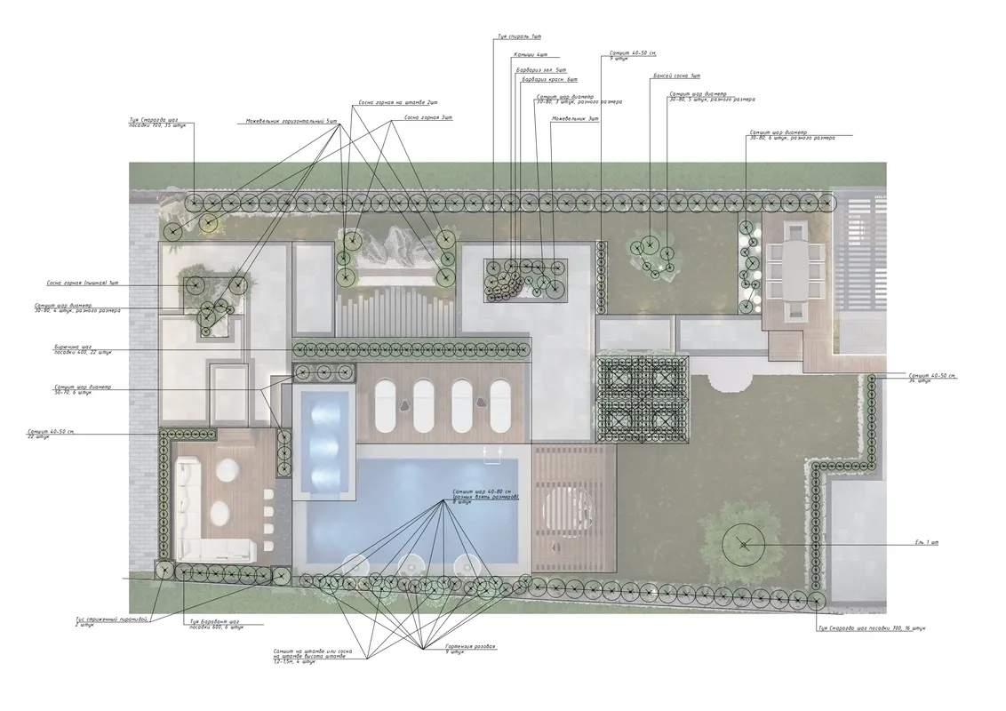 Також необхідно було передбачити місце для басейну, літньої кухні, прибудови з сауною та зони відпочинку. Проект реалізовувався у співпраці з архітектором іншої команди.