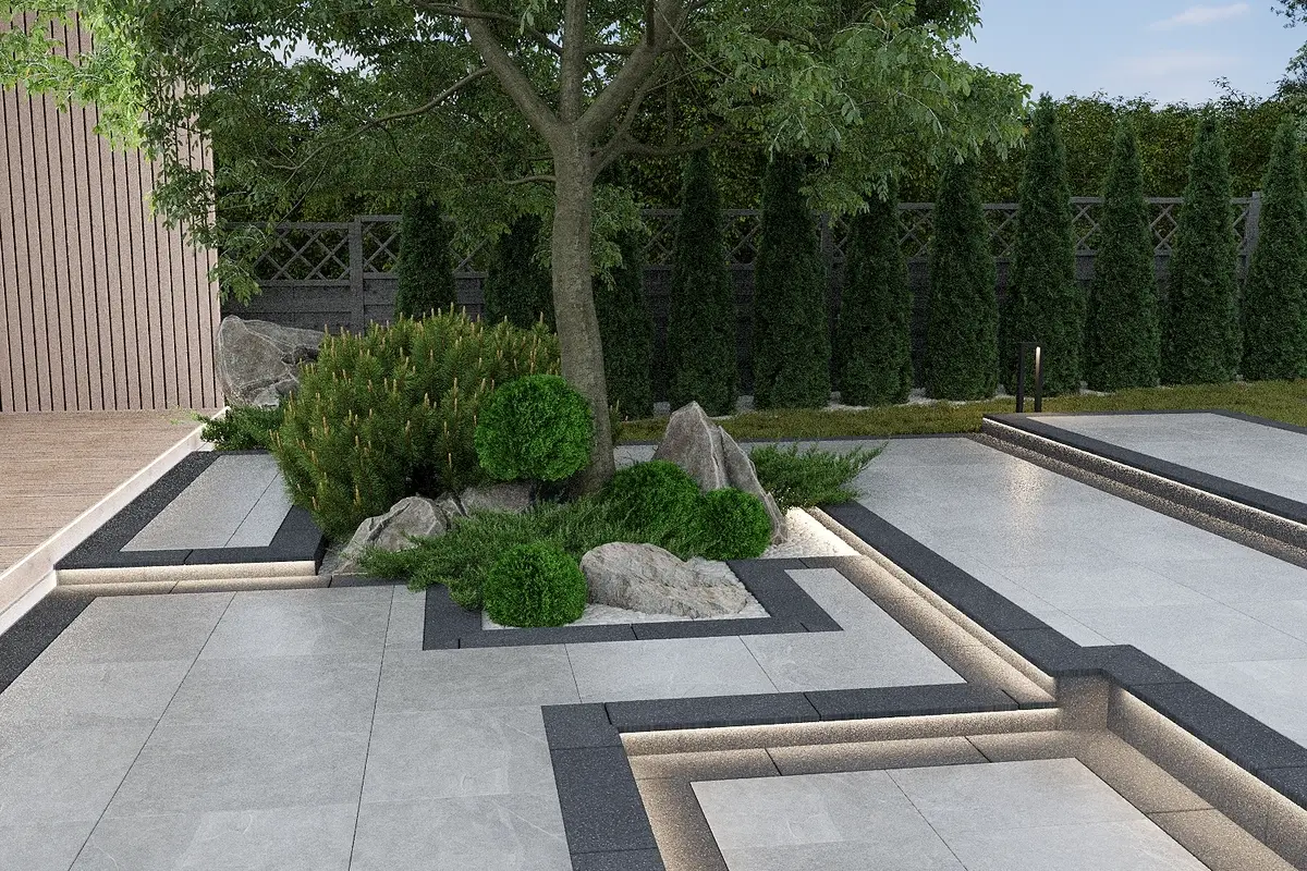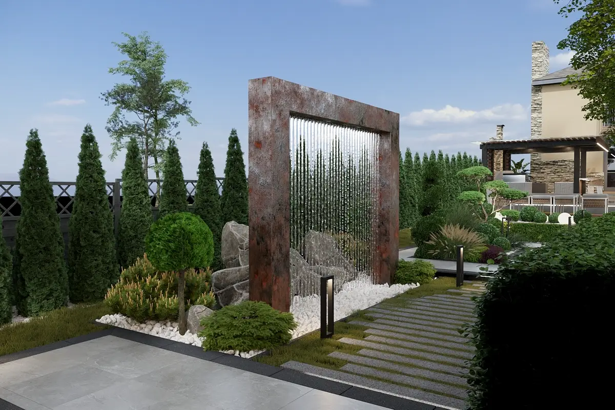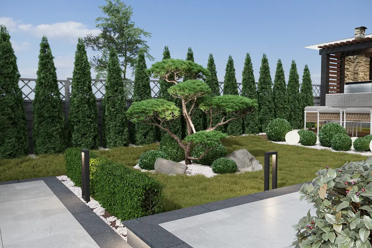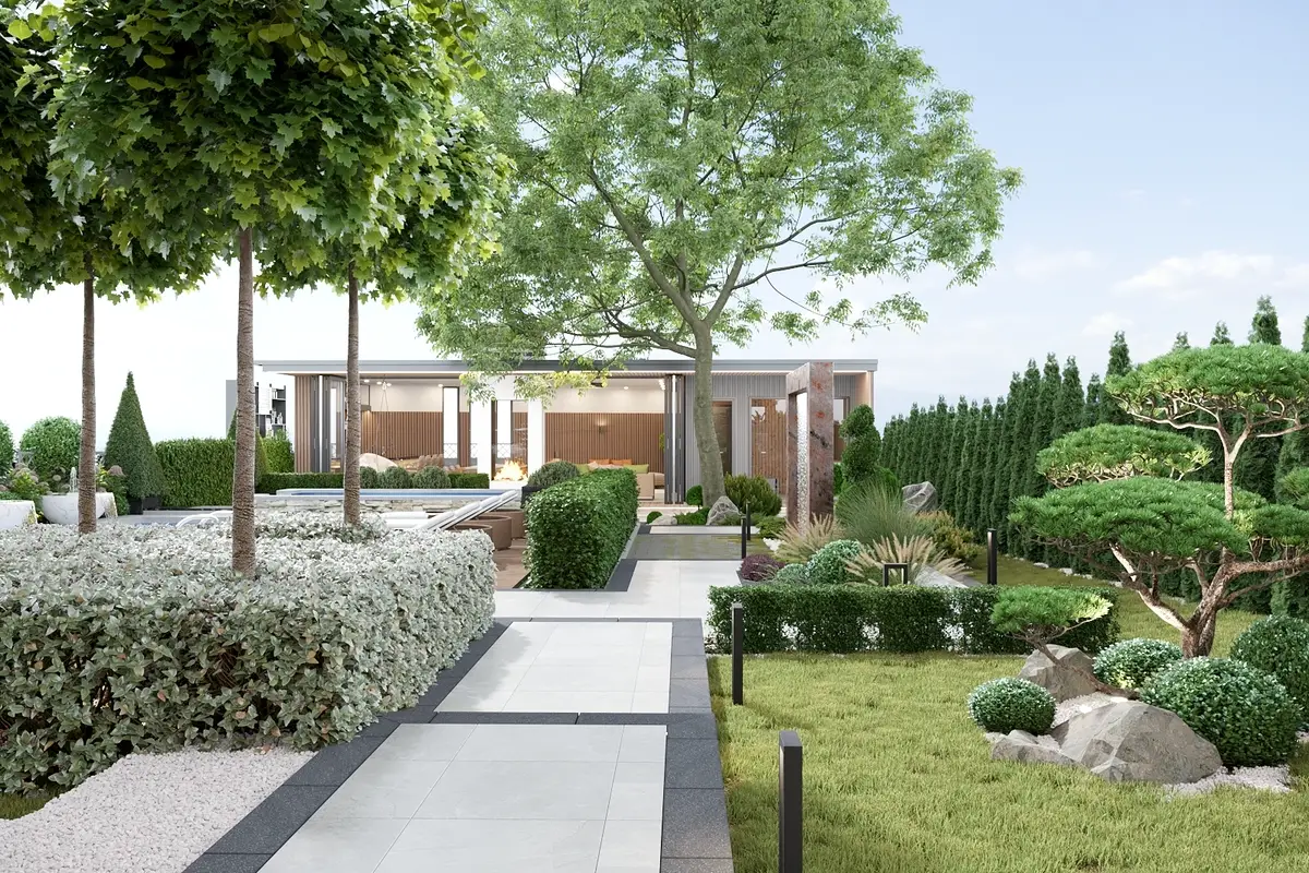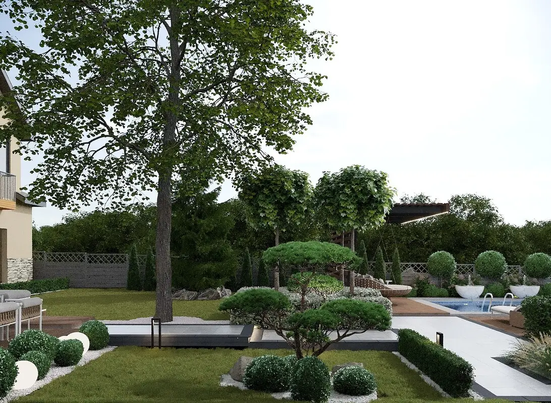 Основною метою було створення гармонійного озеленення ділянки за будинком. Однією з ключових складностей став перепад висоти території, що має ухил донизу.