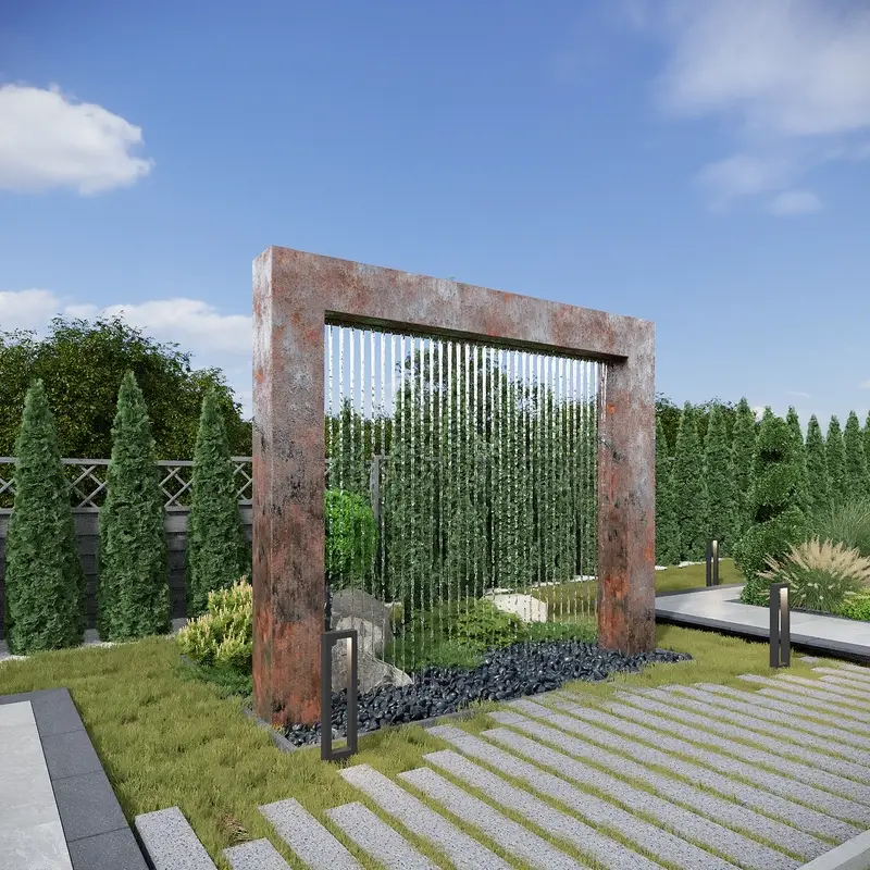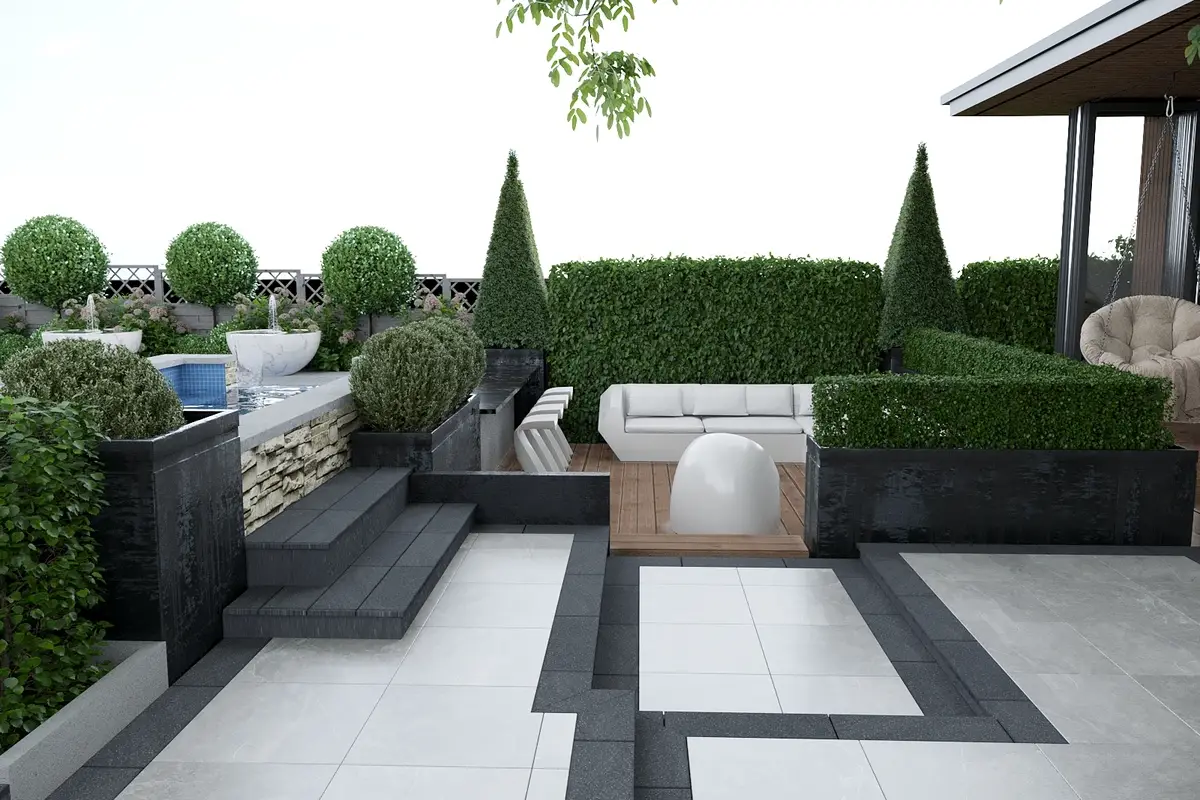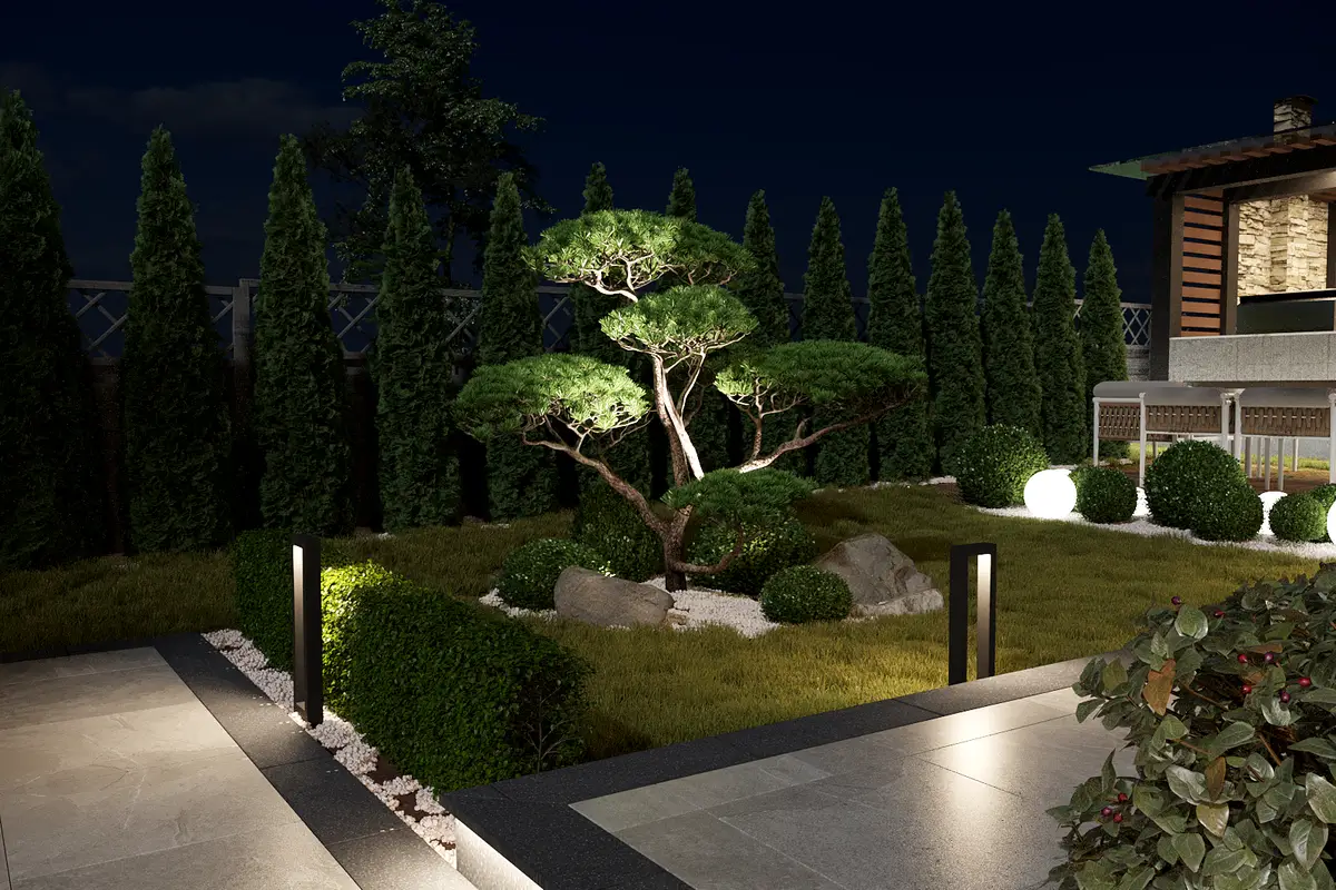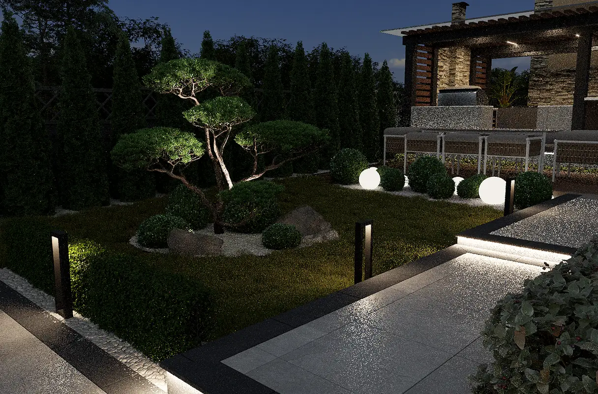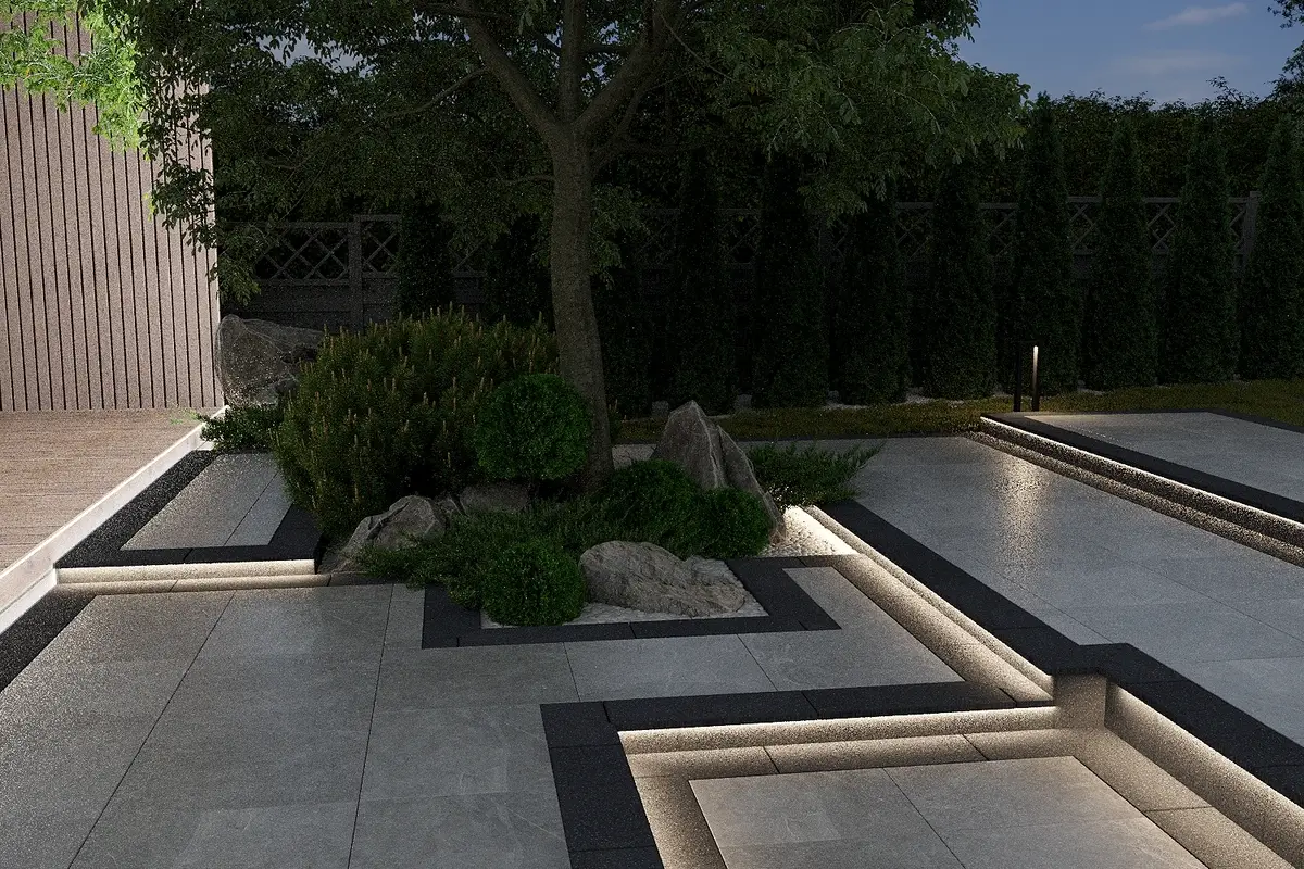 Основною метою було створення гармонійного озеленення ділянки за будинком. Однією з ключових складностей став перепад висоти території, що має ухил донизу.